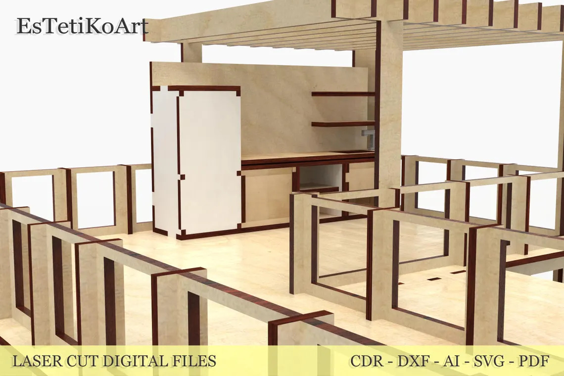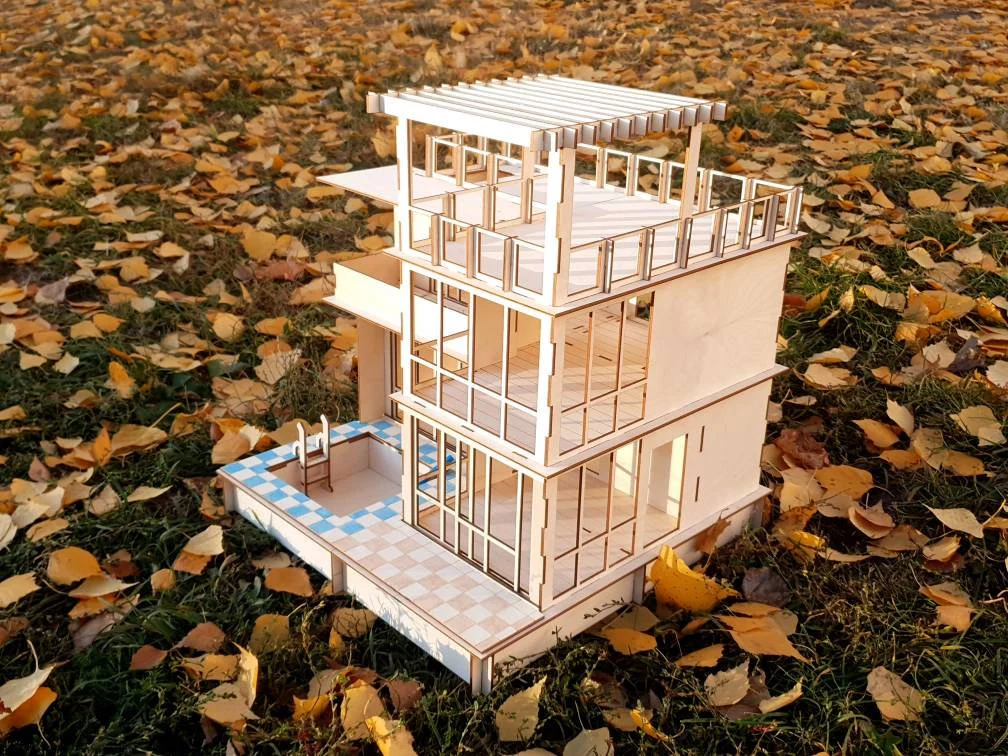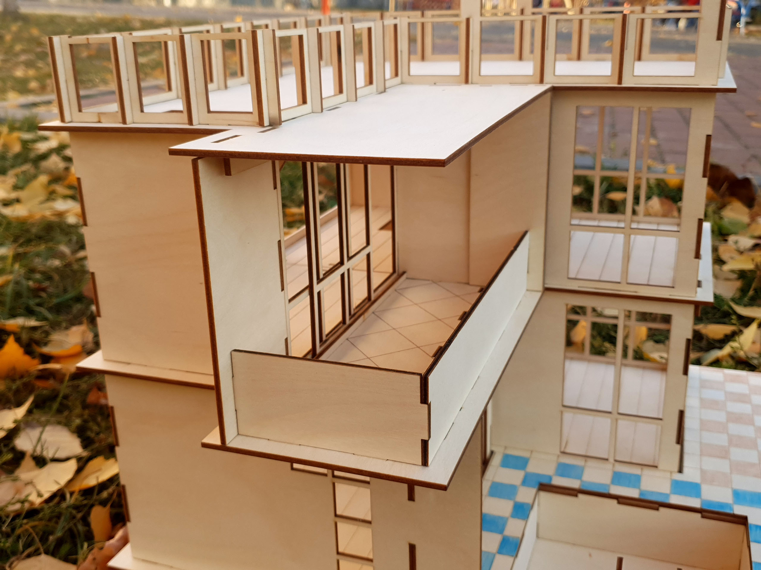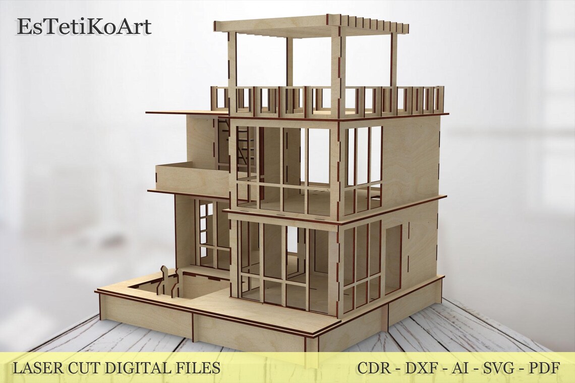 These are digital files for download and laser cutting of a two-story wooden modern TAKO2