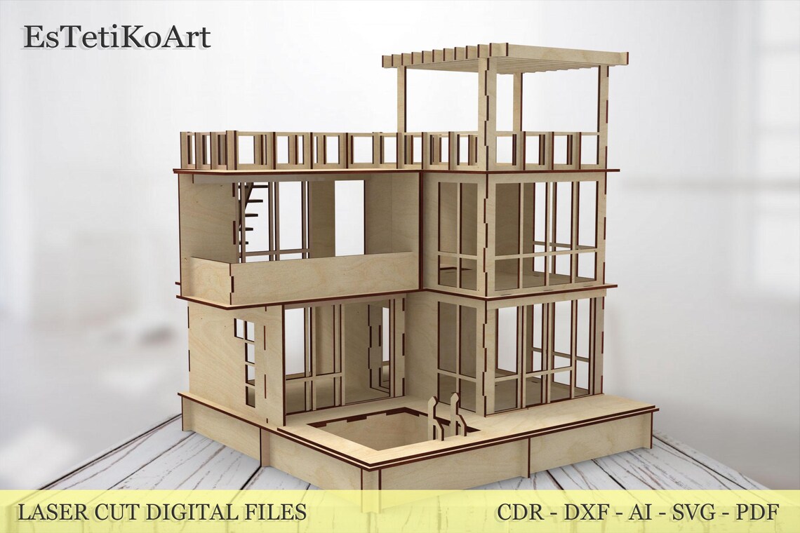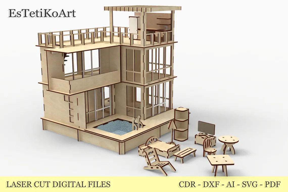 doll house, dollhouse, doll house kit, dollhouse kit, wooden dollhouse, wooden doll house, laser cut dollhouse, modern doll house, house model, diy dollhouse, house svg, dollhouse furniture, miniature dollhouse