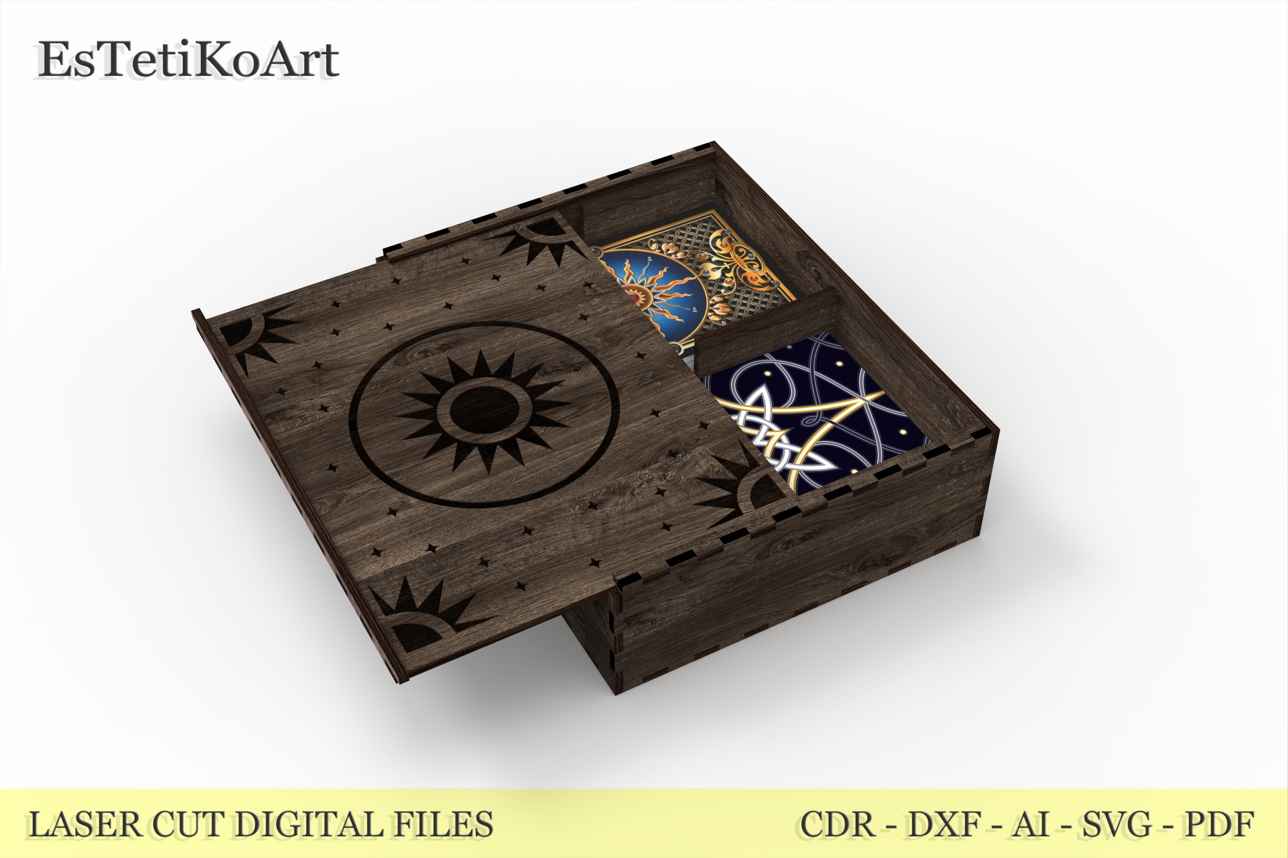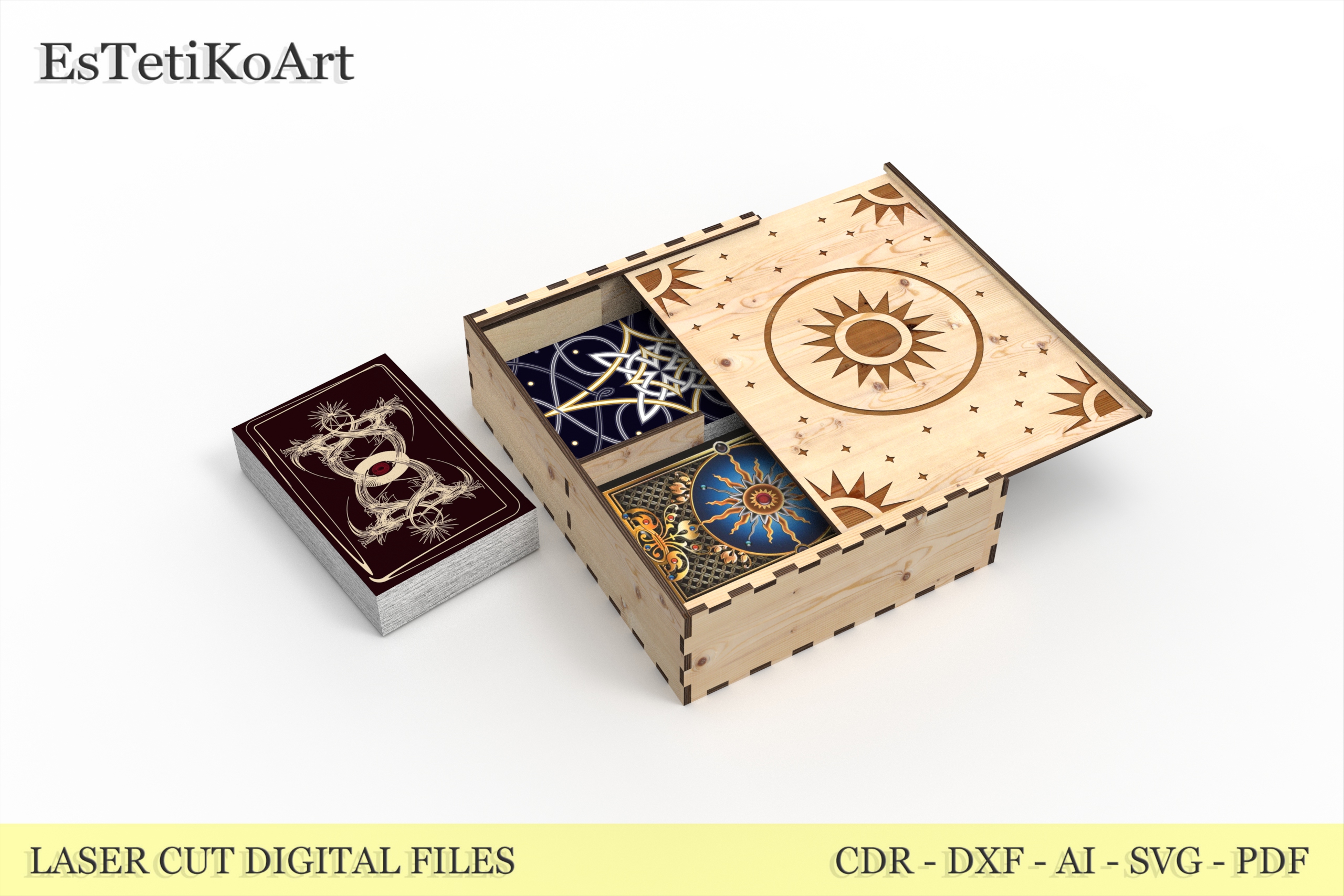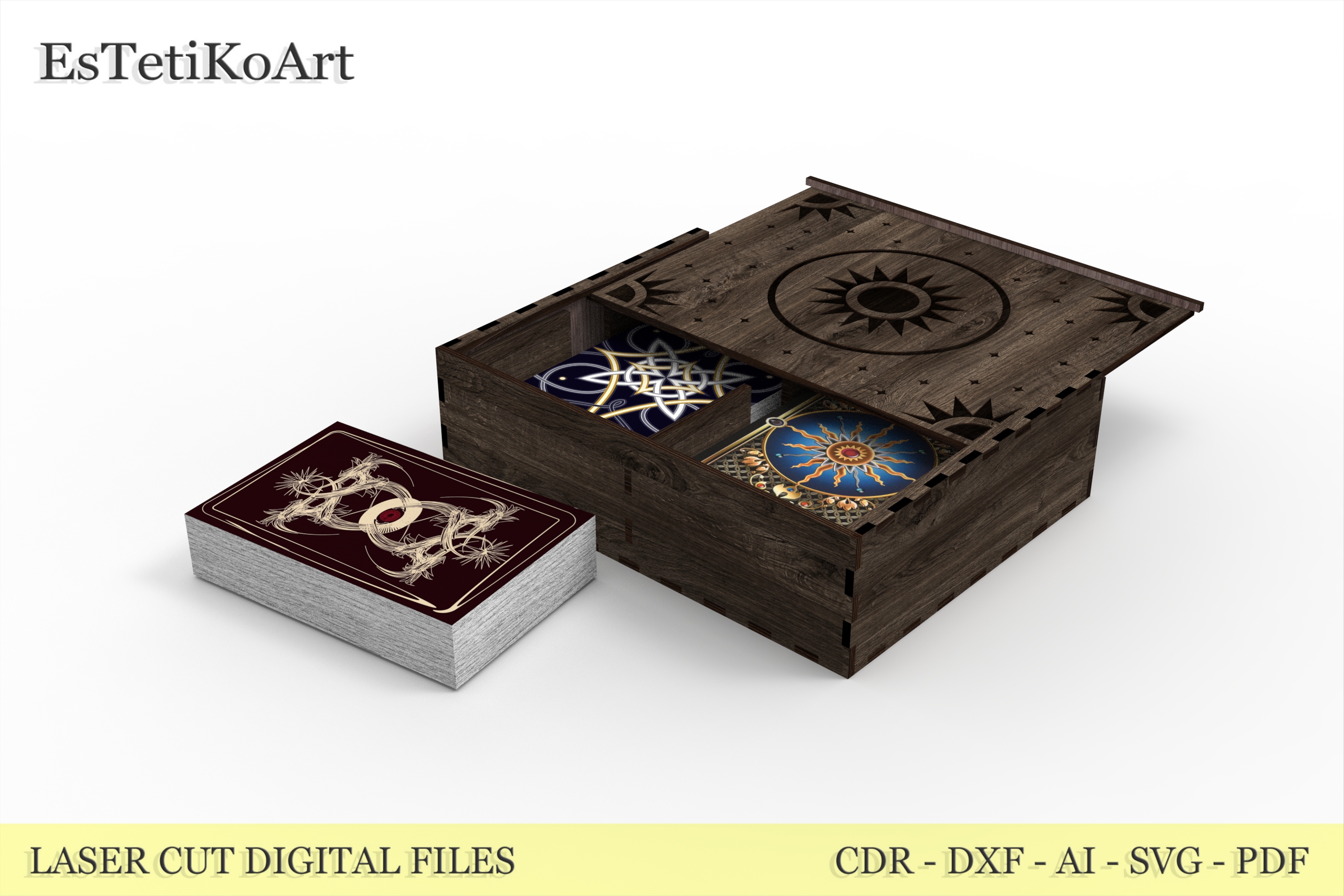 Tarot Card Wooden Box Laser Cut Files – digital download SVG, DXF files for creating a beautiful tarot box for two standard card decks.