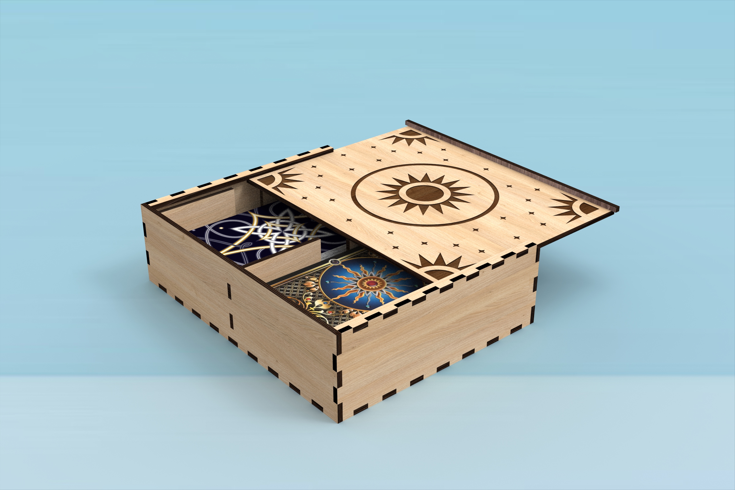 Craft your own elegant wooden Tarot card box with this laser-cut template — designed to hold a two standard 78-card decks (2.75″ × 4.75″).
